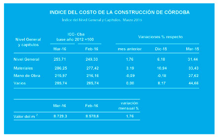En marzo, el Índice del Costo de la Construcción de Córdoba registró un incremento mensual del 1,76 por ciento, según datos de la Dirección General de Estadística y Censos. Las variaciones en los rubros del Índice son las siguientes: “Materiales” (3,19 por ciento), “Mano de obra” (-0,09 por ciento) y “Varios” (0,0 por ciento).