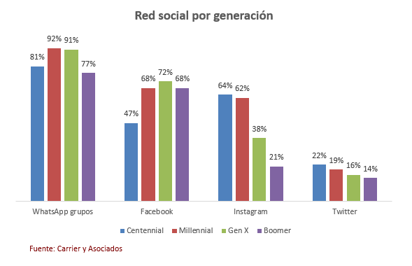 El orden de las cuatro redes más populares en Argentina, tanto en cuentas como en uso regular, son los grupos de Whatsapp, Facebook, Instagram (los tres propiedad de Facebook) y Twitter. Sin embargo, mientras que el 91% de quienes participan de grupos de Whatsapp lo hacen regularmente, este porcentaje desciende a 71% en el caso de Facebook, 62% en el de Instagram y 37% en el caso de Twitter. Si bien esta última red cuenta con pocos usuarios regulares comparada con las que la preceden, tiene una fenomenal caja de resonancia, lo que le da una gran trascendencia en el mundo offline. De las principales redes sociales, la que menor porcentaje de uso regular registra es Snapchat, utilizada por apenas el 17% de quienes tienen cuenta. Una clara muestra de que fue una estrella fugaz.