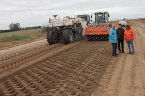 base de asiento. Actualmente, estamos haciendo suelo-cal, para darle debida compactación a la sub base y también estamos comenzando con la etapa de base granular, para a finales del mes de julio comenzar con la
